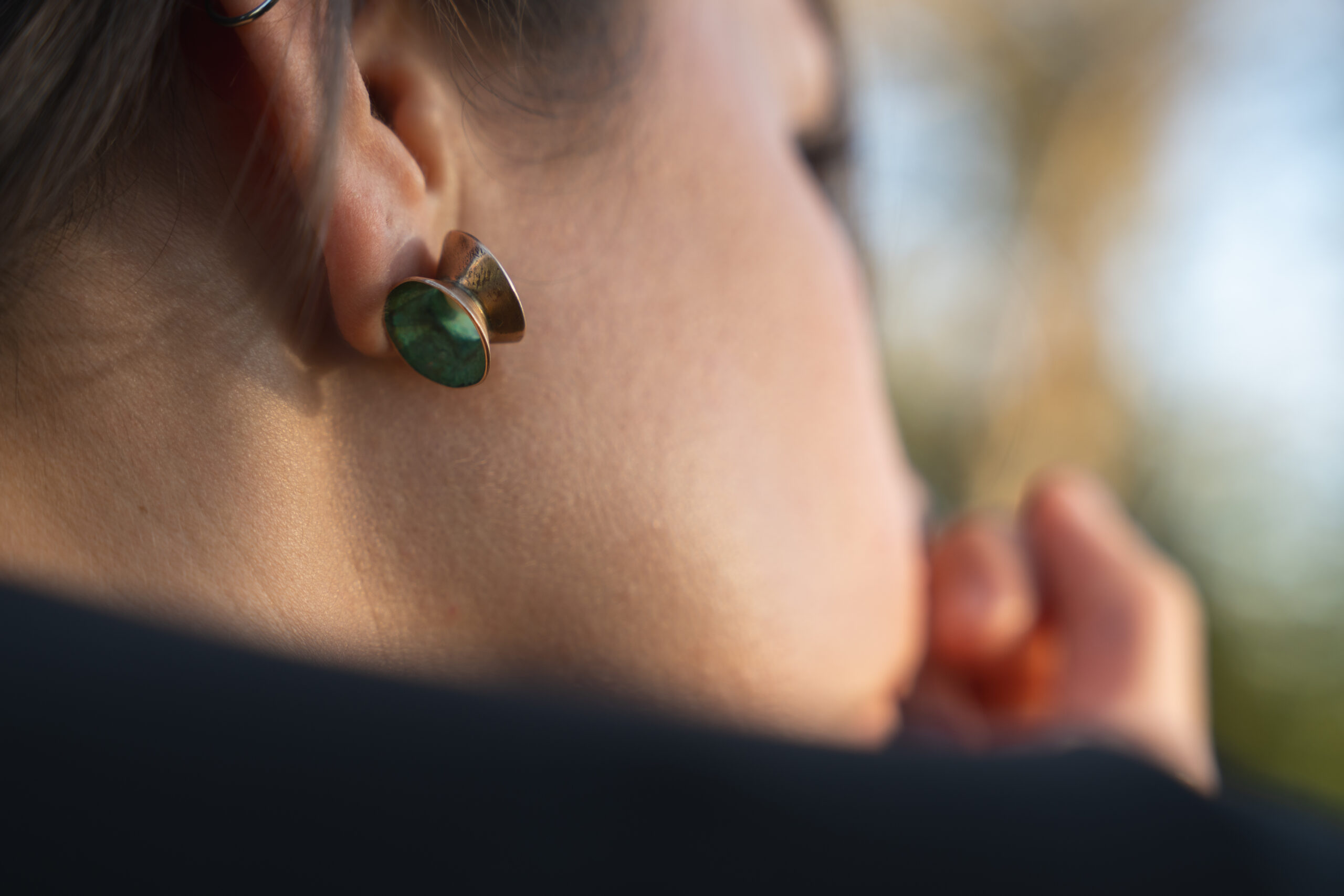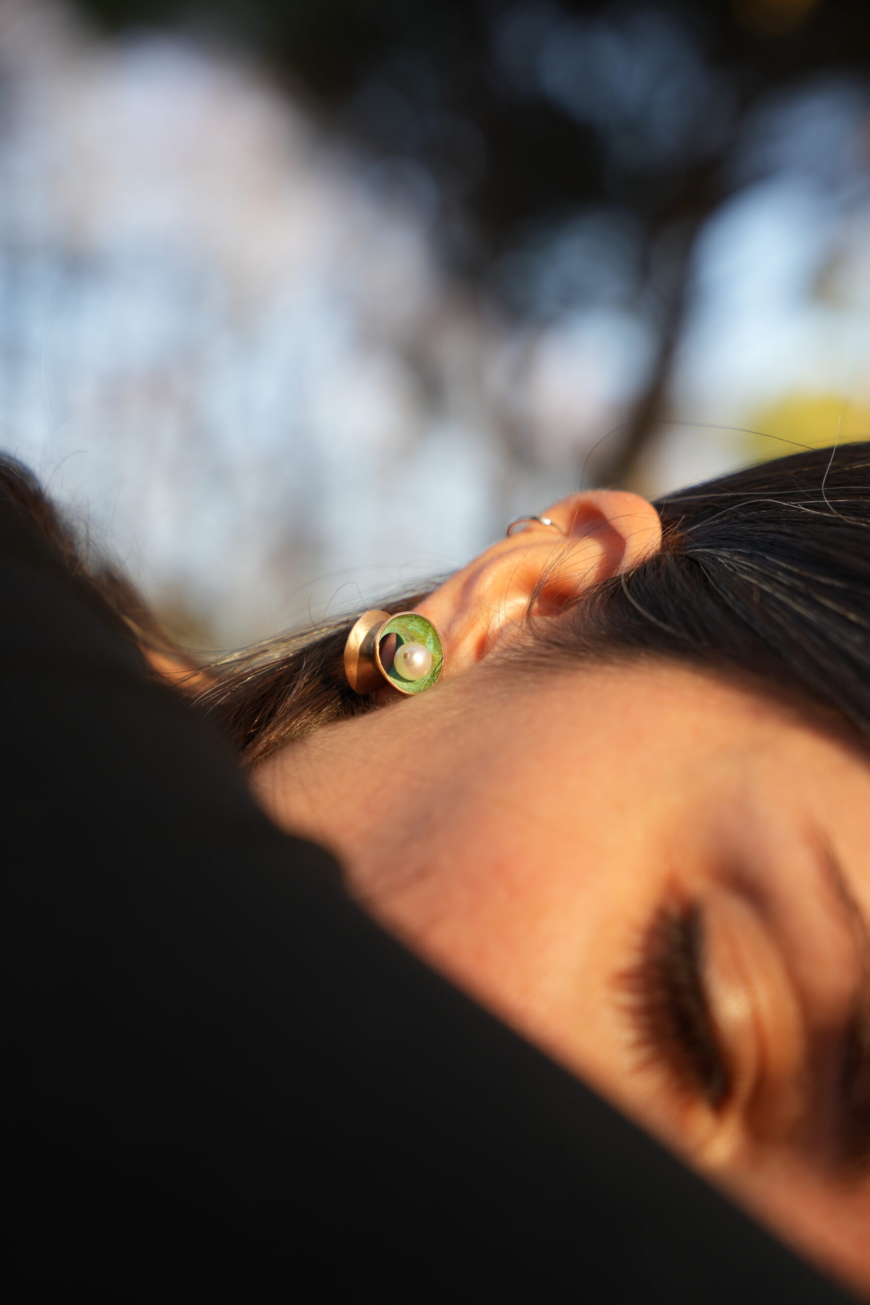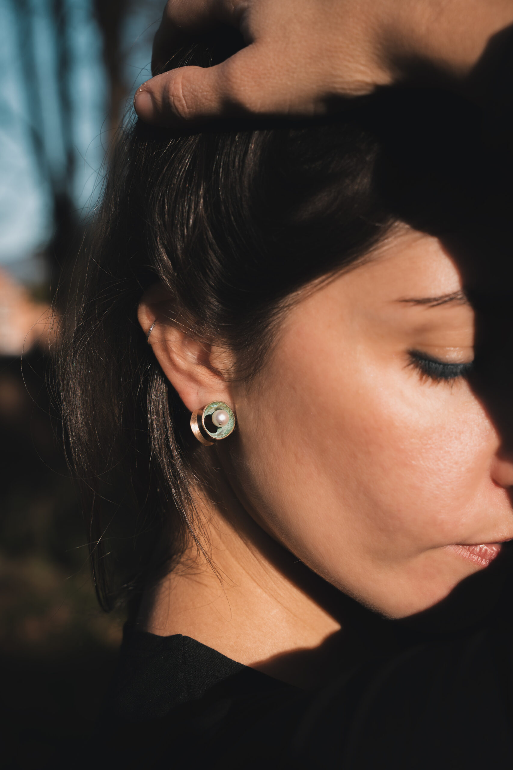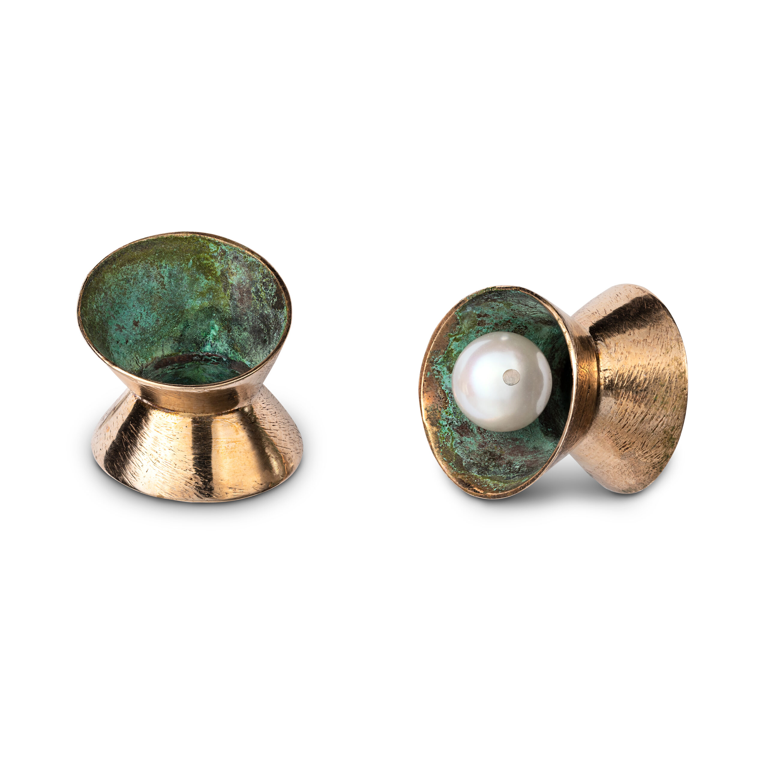 Orecchini in bronzo, pernio in argento 925, resina e perla.